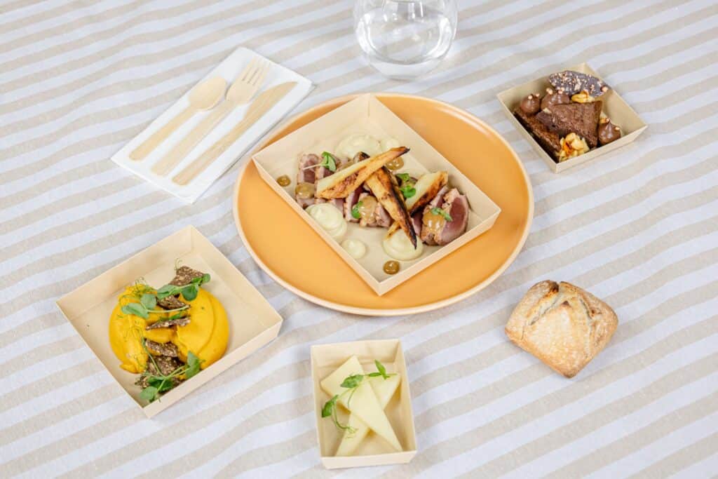végétarienne), un morceau de fromage, un dessert, un petit pains ainsi qu’un kit